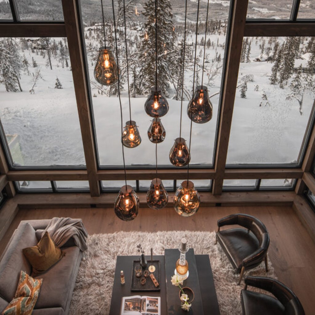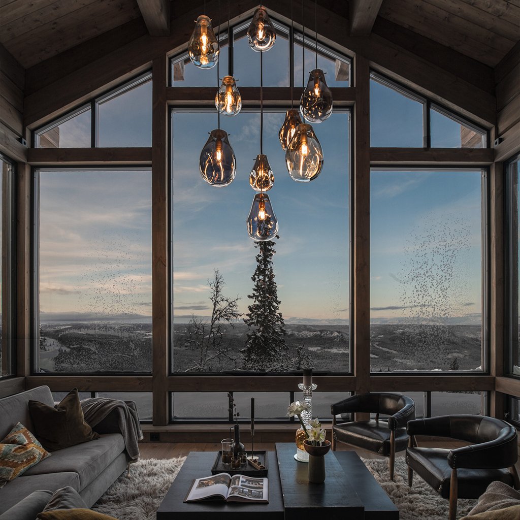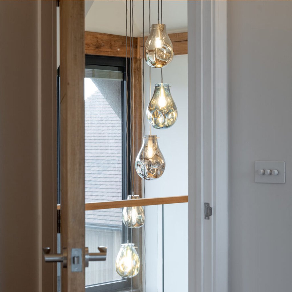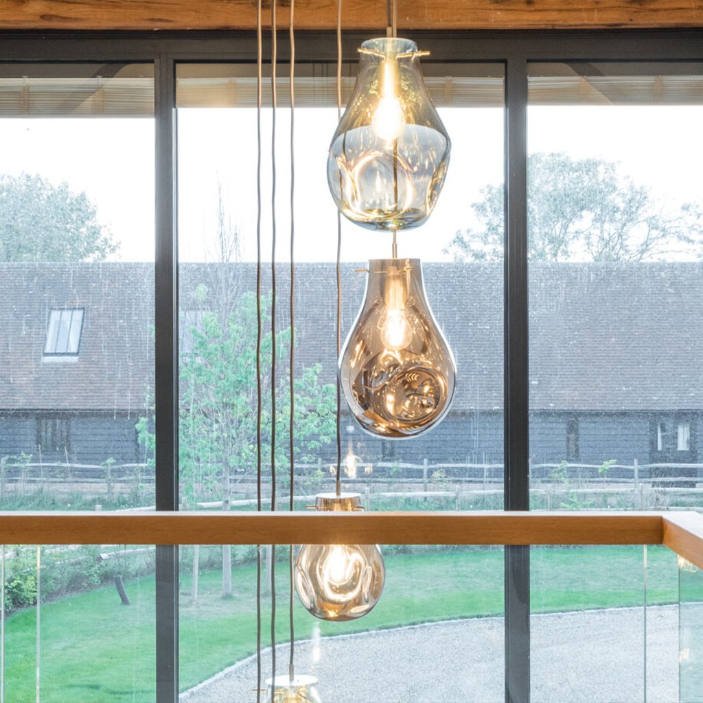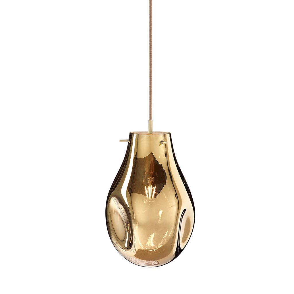 Svítidlo je vyrobeno z ručně foukaného skla a kovu.