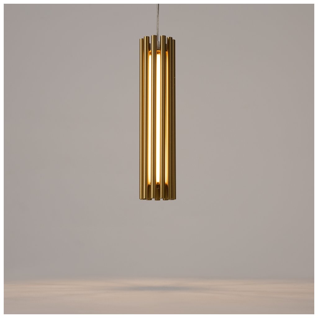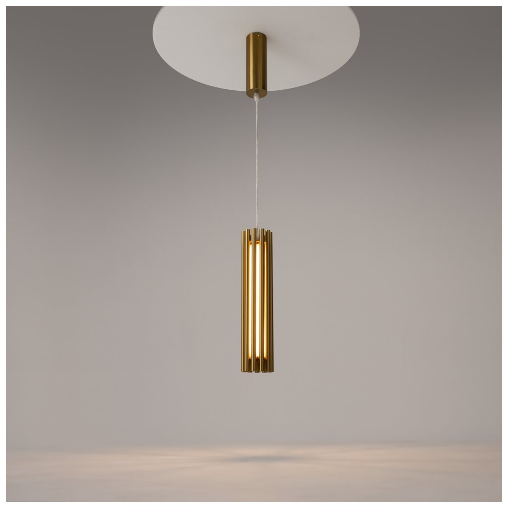 Zajímavé závěsné svítidlo Sonata v sobě spojuje perfektní mosazné válečky do většího, subtilního válečku. Kombinace plynulosti a nespojitosti, promyšlenosti a spontaneity, dokonalých materiálů a přesného umístění tenkých trubic tvoří podmanivé svítidlo, které vytváří dynamickou hru světla a odrazů, a které je zcela nepřehlédnutelné v jakémkoli prostoru.